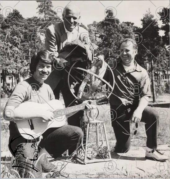 män, gitarr, skog, träd, leende, grupp, svartvitt, natur, stativ, glob, kläder, 1970-tal, vänner, utomhus, samarbete, musik, glädje, fotografi, minnen, tradition
