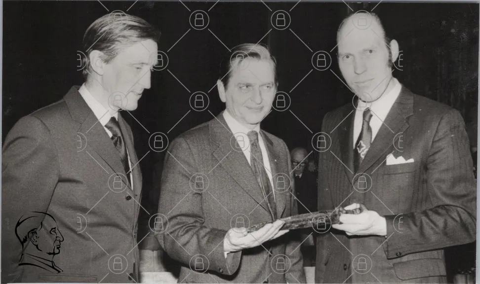 tre män, svartvitt, ceremonie, utmärkelse, presentation, kostymer, 1970-tal, diplomati, handskakning, leenden, formell, historisk, möte, medalj, pris, offentlig, samarbete, tradition, kultur, representation, minne, betydelse, värde, prestation, erkännande, samhälle, ledarskap, respekt, vänskap, händelse