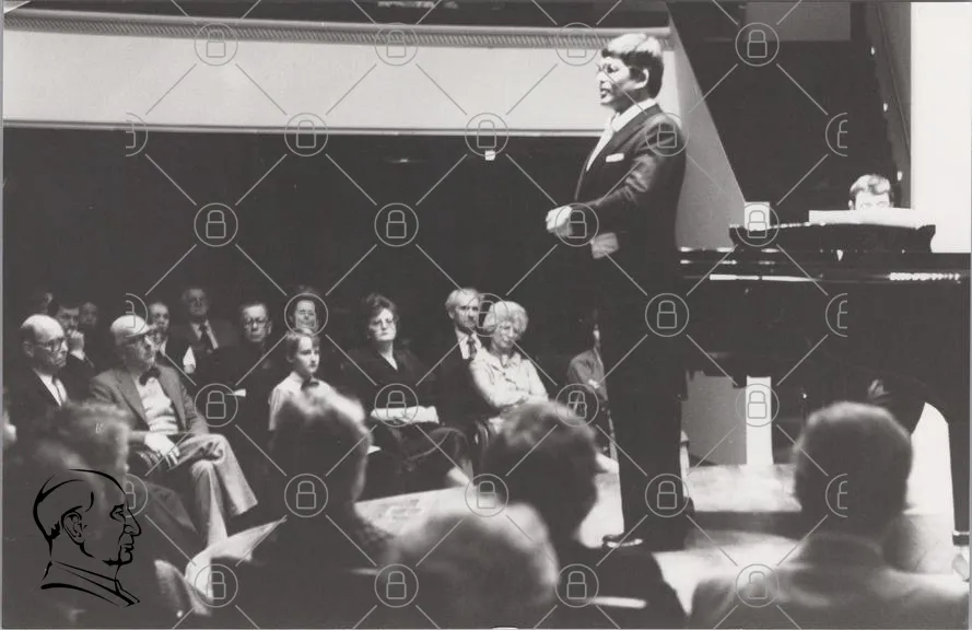 konsert, piano, publik, talare, svartvitt, musik, föreställning, scen, kläder, 1970-tal, artister, åhörare, kultur, underhållning, klassisk musik, evenemang, man, kvinna, leende, applåder, föreläsning
