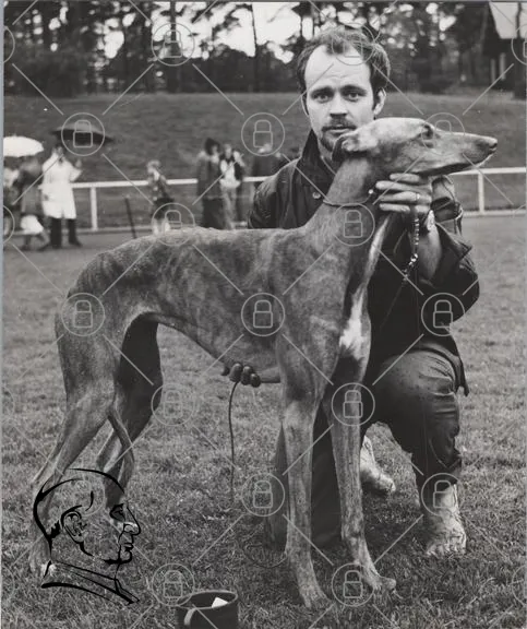 hund, greyhound, man, park, svartvitt, hundutställning, sällskapsdjur, sport, tävling, leda, halsband, gräsmatta, paraply, kläder, 1960-tal, fotografering, djur, människa, natur, utomhus