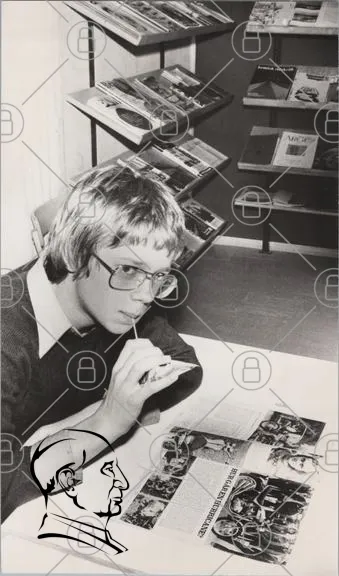 pojke, glasögon, tidningar, läsning, svartvitt, inomhus, 1970-tal, ungdom, studera, kontor, skrivbord, intellektuell, retro, fotografi, kultur, information, forskning, böcker, tidningsställ, koncentration