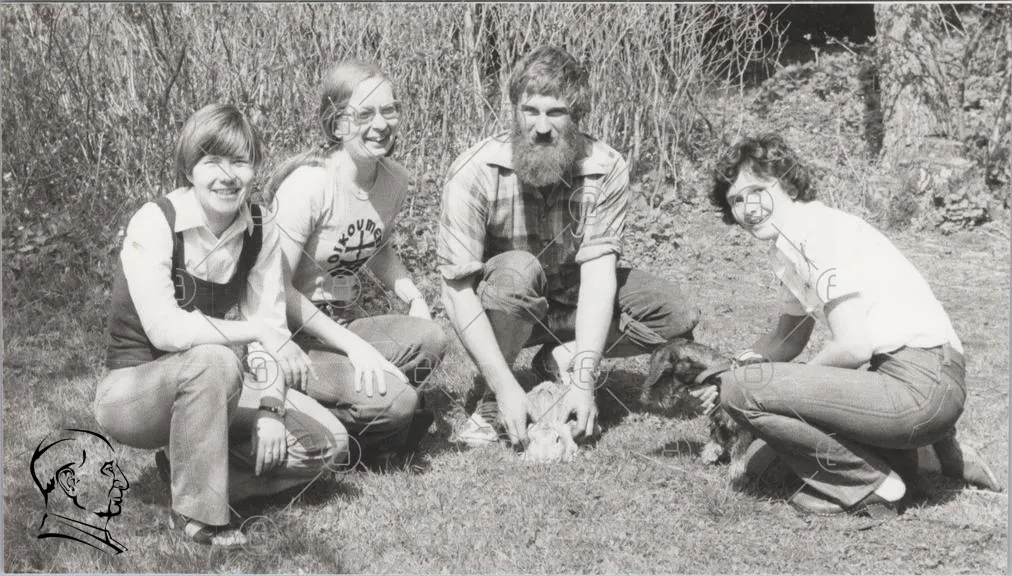 kaniner, människor, utomhus, svartvitt, leende, gräs, familj, djur, 1970-tal, kläder, bearded man, barn, ungdomar, natur, samling, vänskap, glädje, fotografering, tradition, landskap, hobby, fritid, gemenskap, djurhållning, lek, minnen, nostalgi, jordbruk