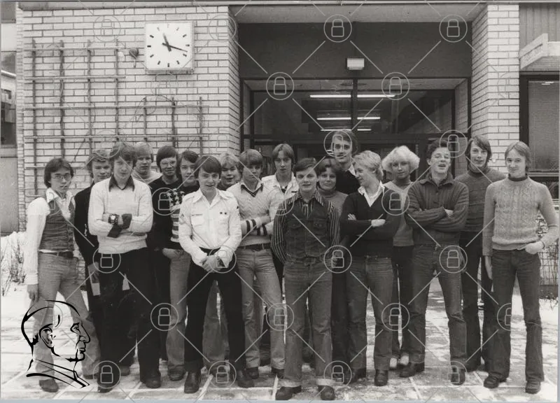 grupp, ungdomar, svartvitt, skola, klocka, 1980-tal, pojkar, flickor, kläder, leenden, fotografering, inomhus, klassrum, retro, stil, gemenskap, vänner, skolprojekt, ungdomskultur, nostalgi, samling, ansikten, skolfoto, tid, minnen, ungdomsgeneration, socialt, interaktion, ungdomsgrupp, klasskamrater