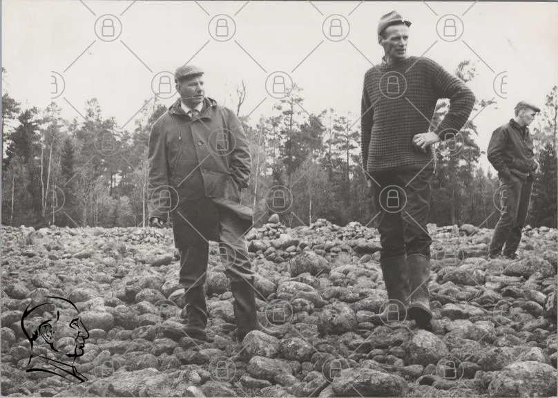 män, mark, stenar, skog, kläder, gummistövlar, svartvitt, landskap, arbete, jordbruk, tradition, natur, fotografering, 1900-tal, utomhus, grus, fält, mänsklig aktivitet, samarbete, historia