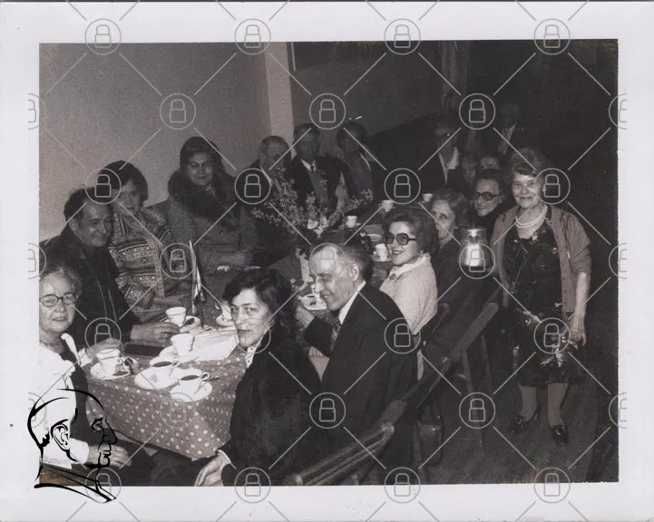fest, middag, sällskap, äldre, människor, bord, kaffe, te, duk, kläder, leenden, samvaro, dekoration, glasögon, servetter, tradition, festligheter, bakgrund, inomhus, svartvitt, fotografi, gemenskap, minnen, socialt, festmåltid, samling, artighet, samtal, skratt