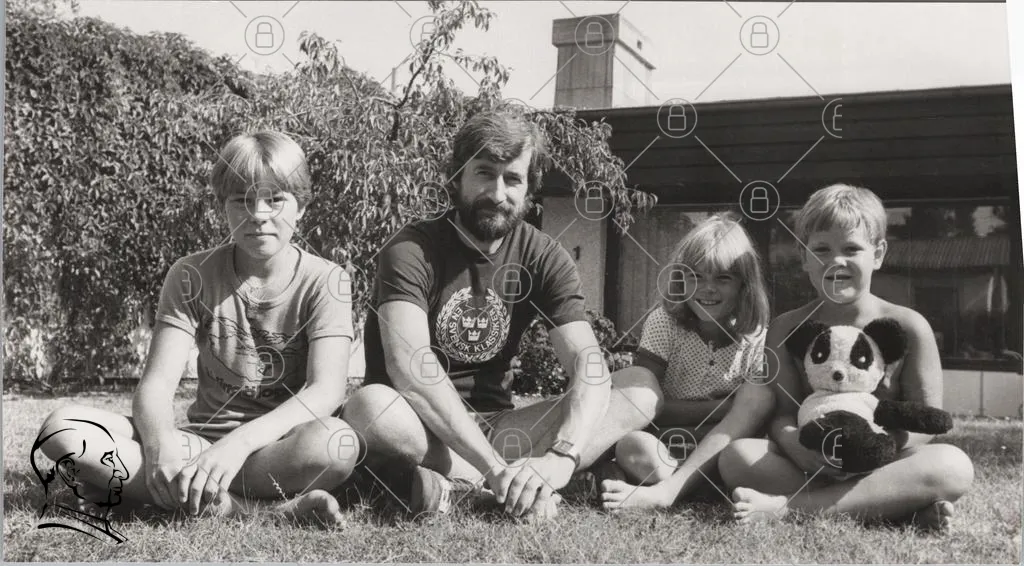 barn, familj, utomhus, gräs, svartvitt, leende, pojkar, flickor, vuxen, tröja, shorts, sommar, 1970-tal, fotografi, gemenskap, natur, avslappnad, minnen, tradition, kärlek