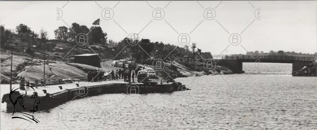 hamn, bilar, människor, väg, vatten, svartvit, landskap, brygga, träd, flagga, båtar, trafik, kust, natur, historia, 1900-tal, transport, byggnader, fotgängare, panoramavy, stillhet, miljö, sjö, vägkorsning, fordon, kustlinje, samhälle, aktivitet, landsbygden, resande