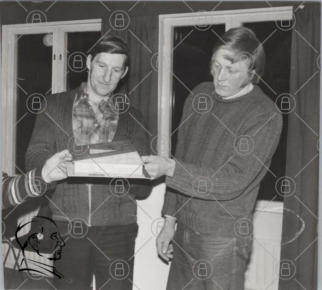 män, svartvitt, inomhus, present, gåva, kläder, tröjor, fönster, möte, 1970-tal, interaktion, leende, bord, stolar, vänskap, diskussion, gest, förväntan, nostalgisk, tradition