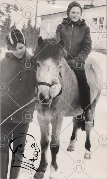 häst, barn, snö, vinter, ridning, sällskap, natur, svartvitt, flicka, pojke, leende, djur, utomhus, bondgård, vänskap, tradition, kläder, mössa, rep, hästskötare, landskap, nostalgi, barndom, lek, glädje, familj, fritid, aktivitet, hästtillbehör, ridutrustning