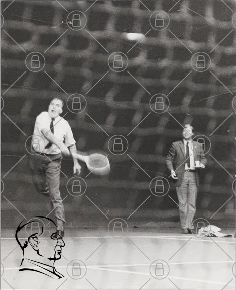 tennis, spelare, racket, nät, sport, svartvitt, träning, man, motion, aktivitet, inomhus, tävling, 1970-tal, retro, klassisk, idrott, koncentration, teknik, precision, uppvisning, föreställning, publik, vän, kläder, stil, hållning, rörelse, energi, dynamik