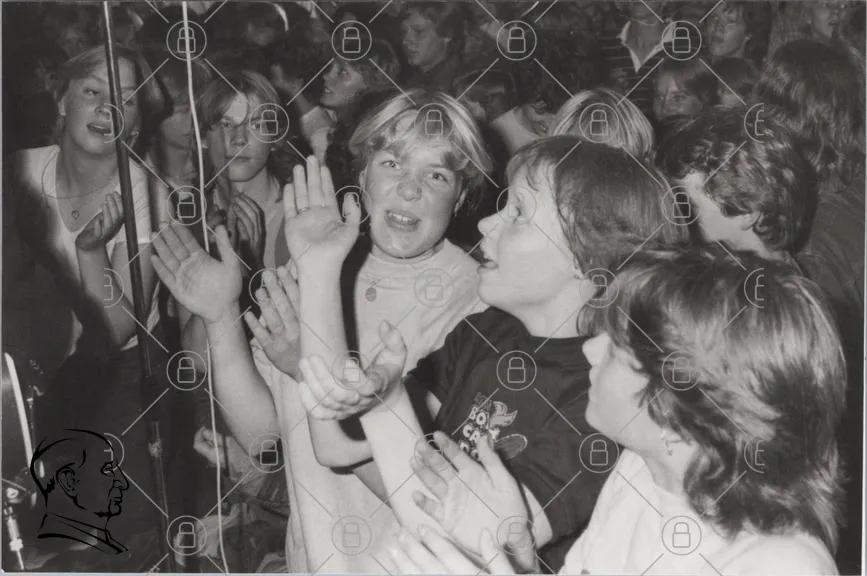 ungdomar, konsert, fest, musik, 1980-tal, svartvitt, glädje, dans, publik, händer, ansikten, kläder, minnen, ungdomskultur, socialt, samling, uttryck, energi, gemenskap, nostalgi, feststämning