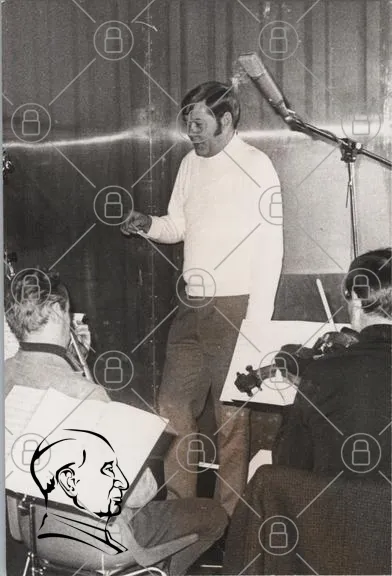 studio, inspelning, musik, dirigent, musiker, 1970-tal, mikrofon, notblad, samarbete, ljud, kreativitet, repetition, kläder, svartvitt, grupp, fokus, presentation, instrument, arrangemang, konst, kultur, ljudteknik, professionell, teamwork, scen, uttryck, kommunikation, historia