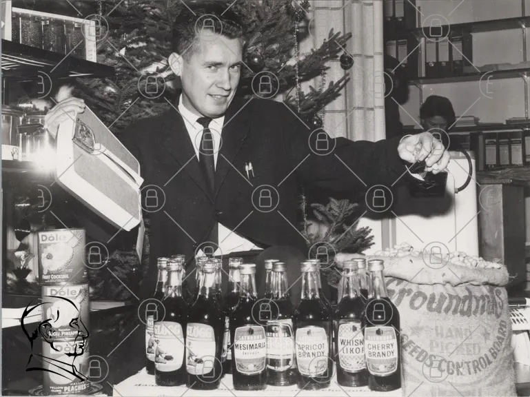 man, flaskor, drycker, julgran, svartvitt, vintage, fest, alkohol, reklam, 1960-tal, glas, kavaj, flaska, likör, socker, jul, tradition, servering, samling, butik, festligheter