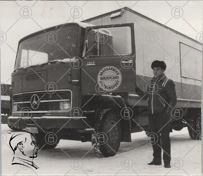 lastbil, transport, snö, vinter, man, Mercedes, logotyp, svartvitt, fordon, lastbilschaufför, Svalgård, Brando, lastbilstransport, 1313, landskap, frakt, arbetskläder, vinterkläder, snölandskap, retro