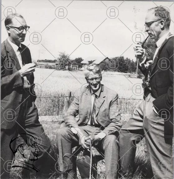 tre män, svartvitt, 1950-tal, landskap, fält, glasögon, kostymer, pipa, sittande, stående, fotografi, natur, traditionell, svensk, vänskap, samtal, historia, gammal, utomhus, avkoppling, stil, kläder, leende, mänsklig interaktion, nostalgisk, kultur, porträtt, socialt, samvaro