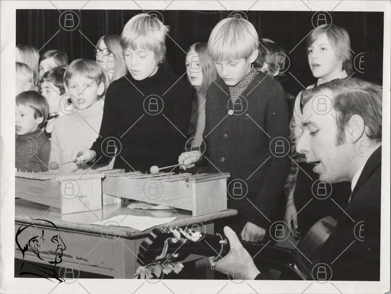barn, musik, sång, instrument, gitarr, xylophon, uppträdande, skola, 1970-tal, svartvitt, grupper, pojkar, flickor, scen, klassrum, barnkör, repetera, ungdomar, tradition, kultur, nöje, gemenskap, lärande, kreativitet, föreställning, artister, samarbete, glädje, minnen, nostalgi