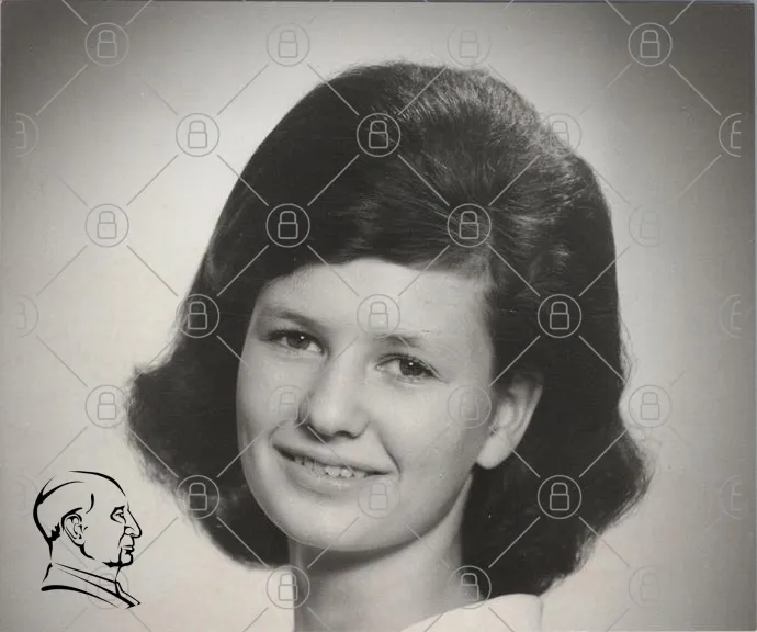 porträtt, kvinna, svartvitt, 1960-tal, frisyr, leende, ungdom, fotografi, vintage, klassisk, ansikte, stil, nostalgi, skönhet, enkelhet, charm, uttryck, minne, personlig, elegant, naturlig, ungdomlig, mode, tidlös, historia, kultur, identitet, känsla, karaktär, detalj