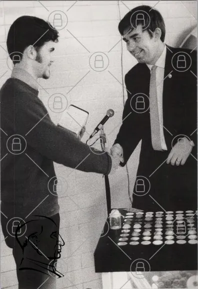 man, handskakning, mikrofon, presentation, publik, svartvitt, 1960-tal, konferens, talare, anteckningar, glasbehållare, interaktion, kläder, kostym, leende, evenemang, diskussion, teknik, demonstration, samarbete, socialt, professionellt, scen, fokus, kommunikation, grupp, information, utbildning, traditionell, stil
