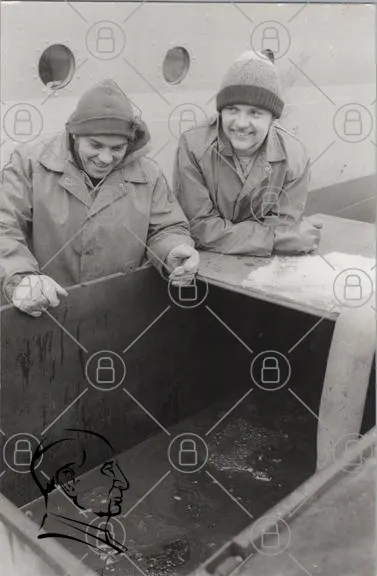 män, arbete, industri, svartvitt, historisk, leende, kläder, verkstad, maskiner, fiske, fiskeindustri, teamwork, mänsklig interaktion, gammal bild, arbetsmiljö, fiskeprodukter, tradition, hantverk, samarbete, arbetskläder