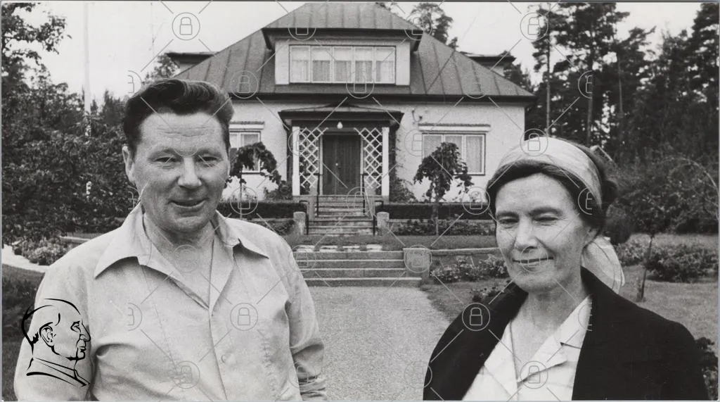 hus, trädgård, par, man, kvinna, svartvitt, byggnad, entré, fönster, tak, växter, grusgång, stil, 1900-tal, landskap, familj, traditionell, arkitektur, utomhus, porträtt, historia, hem, natur, sommar, gammal, kultur, gemenskap, minnen, fotografi