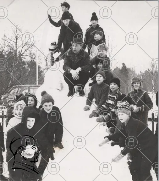 snö, barn, lek, vinter, snöhög, hattar, skratt, utomhus, grupp, fotografering, svartvitt, snöboll, kläder, träd, glädje, gemenskap, snölandskap, barnlek, tradition, minnen