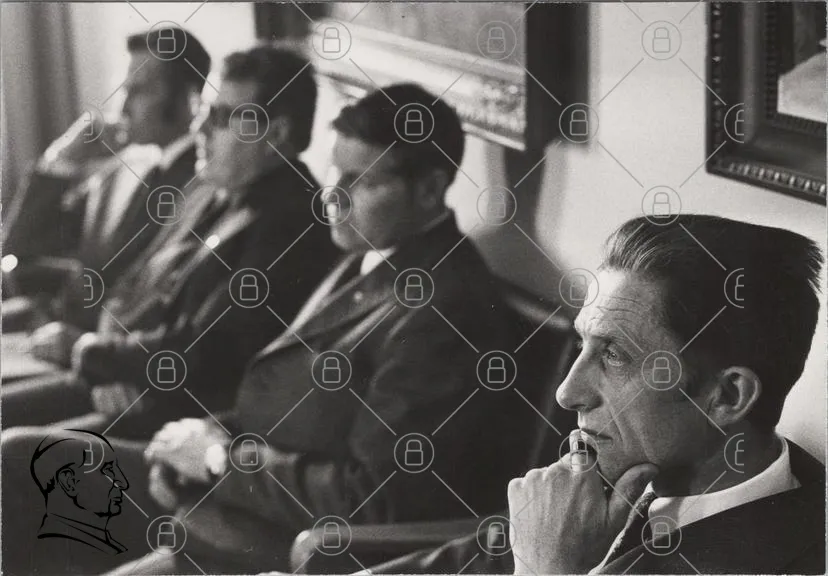 svartvit, män, sittande, möte, 1960-tal, kostymer, allvarliga, inomhus, ansikten, diskussion, retro, historisk, fotografi, grupp, fokus, uttryck, stil, kontor, traditionell, professionell, interiör, samarbete, kommunikation, kroppsspråk, observation, detaljer, kläder, uttryck, social, relationer, tidsepok