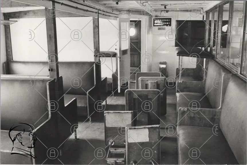 fartyg, interiör, sittplatser, båt, svartvit, inredning, dörr, fönster, bänkar, utrymme, marin, design, 1900-tal, passagerare, komfort, stil, trä, metall, belysning, atmosfär, historisk, transport, resande, rum, avskildhet, funktionalitet, enkelhet, struktur, detaljer, miljö