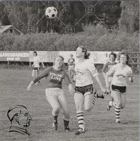 fotboll, kvinnor, sport, spelare, boll, gräs, lag, Viking Line, träning, tävling, svartvitt, 1980-tal, idrott, ungdomar, fotbollsplan, rörelse, gemenskap, aktivitet, utomhus, matcher