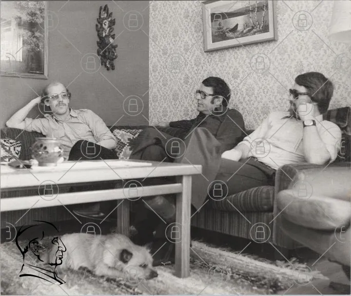 tre män, soffa, hund, inomhus, svartvitt, 1970-tal, möbler, väggkonst, bord, avslappnad, samtal, glasögon, skägg, stil, interiör, matta, kavaj, skjorta, heminredning, vintage