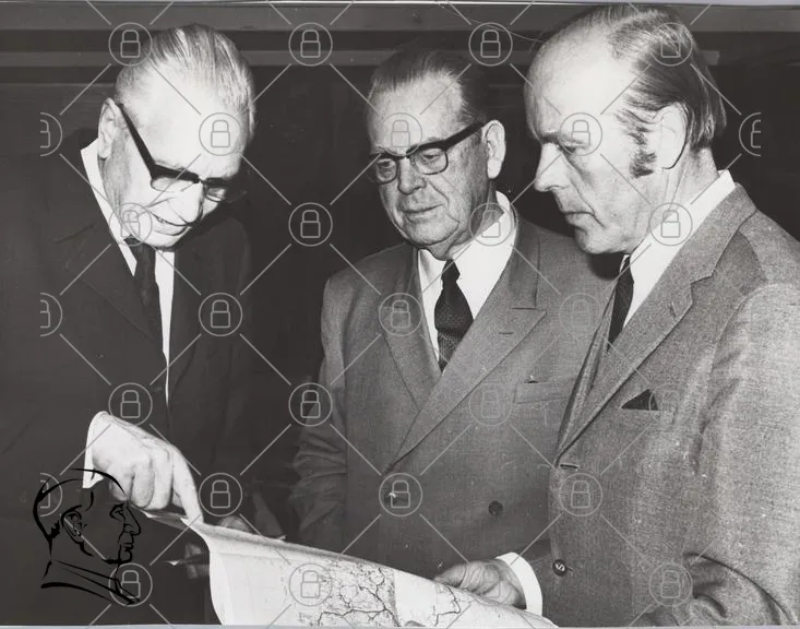 tre män, svartvitt, diskussion, karta, affärsmöte, 1960-tal, glasögon, kostymer, kontor, professionell, samarbete, planering, dokument, teknik, historia