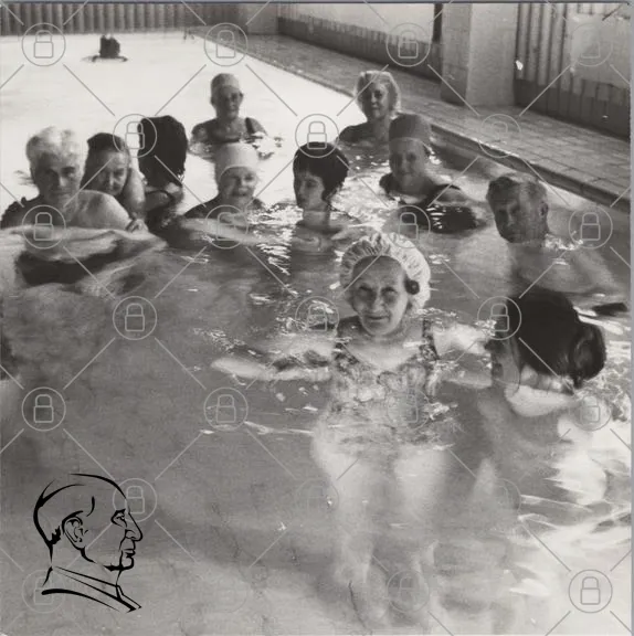 simning, pool, äldre, kvinnor, grupp, svartvit, badmössor, vatten, aktivitet, socialt, nöje, träning, hälsa, gemenskap, skratt, glädje, avkoppling, motion, simhall, fritid
