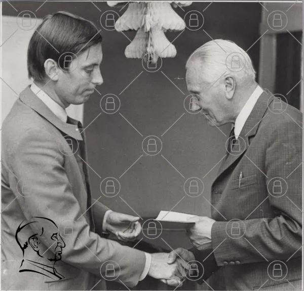 svartvit, foto, män, handskakning, ceremoni, kläder, kontor, 1970-tal, diplom, utmärkelse, tradition, samarbete, presentation, leenden, professionell, interaktion, bakgrund, inomhus, relation, historia, kultur, stil, uttryck, respekt, vänskap, gest, minne, betydelse, ögonkontakt, formalitet