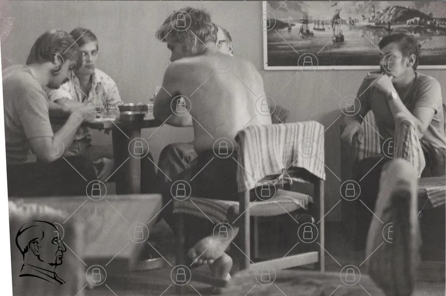 svartvit, människor, sittande, mat, dryck, bar, avslappnad, samtal, inomhus, kläder, 1970-tal, retro, fot, rygg, stol, bord, skägg, frisyr, kultur, socialt, interaktion, stil, vintage, fotografi, nostalgi, kompisar, vänskap, miljö, atmosfär
