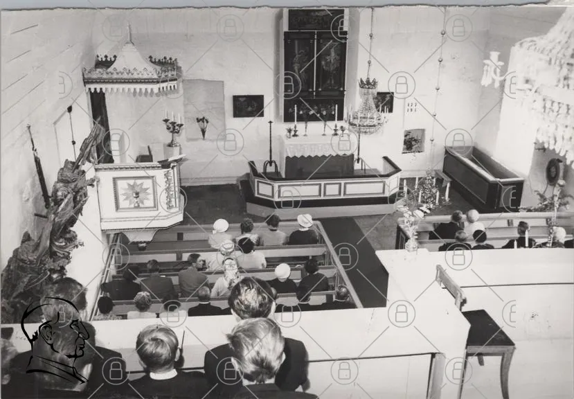 kyrka, gudstjänst, bänkar, altar, predikstol, människor, belysning, väggar, blommor, tak, stolar, kläder, svartvitt, inredning, tradition, samling, andakt, gemenskap, högtid, kultur