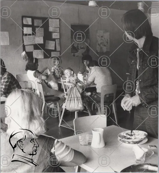 café, människor, bord, stolar, docka, mat, dryck, svartvitt, 1970-tal, samtal, kläder, inredning, väggar, anteckningar, tavla, leende, socialt, gemenskap, barn, vuxna, avslappnad, miljö, interiör, aktiviteter, samvaro, traditionell, kultur, nostalgi, familj