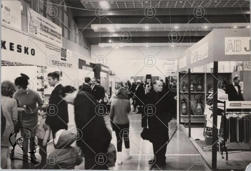 mässa, utställning, människor, svartvitt, 1960-tal, besökare, montrar, produkter, samling, evenemang, inomhus, kläder, interaktion, publik, företag, presentation, information, stående, sittande, diskussion, aktiviteter, hall, belysning, reklam, brandfarliga, säkerhet, teknik, konst, kultur, nätverkande