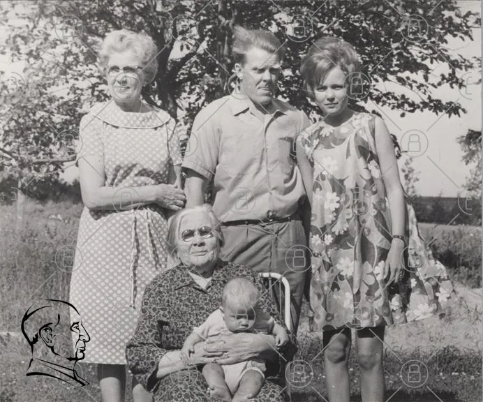 familj, svartvitt, foto, äldre, kvinna, man, barn, flicka, klänning, stol, utomhus, träd, generationer, 1960-tal, porträtt, tradition, samling, leende, nostalgiskt, minnen
