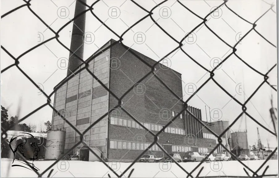 fabrik, byggnad, industri, rökstack, stängsel, snö, bilar, fönster, tegel, 1900-tal, svartvitt, arkitektur, urban, landskap, maskiner, produktion, anläggning, kontor, lager, betong, metall, utsikt, historia, miljö, industriområde, transport, teknik, verksamhet, säkerhet, struktur