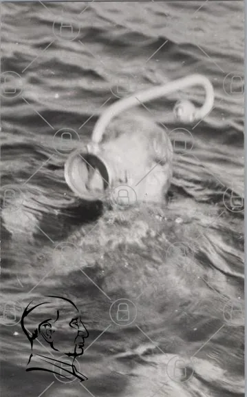 dykare, dykutrustning, undervattensmiljö, hav, vatten, dykning, gammal teknik, dykardräkt, snorkel, bubblor, svartvitt, historisk bild, djuphav, utforskning, marin, dykare med hjälm, undervattensforskning, dykning i havet, dykare i aktion, dykningsteknik, dykare med utrustning