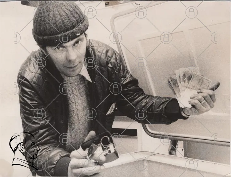 man, pengar, kontanter, kassa, svartvitt, jacka, mössa, hand, kamera, frysbox, 1980-tal, retro, brott, mysterium, dokumentär, vintage, uttryck, ansikte, gest, inomhus, belysning, detaljer, föremål, situation, spänning, historia, samhälle, kultur, ekonomi, säkerhet