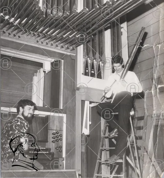 musiker, orgel, gitarr, trappa, svartvitt, inomhus, 1960-tal, instrument, musik, man, leende, vintage, ljud, rum, akustik, trä, teknik, kreativitet, samarbete, uppträdande, studio, arrangemang, retro, kultur, hobby, passion, konst, ljudteknik, improvisation, underhållning