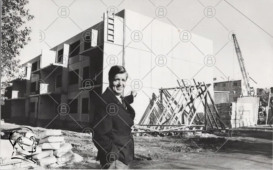 byggnad, konstruktion, man, svartvit, 1970-tal, byggarbetsplats, fasad, trappa, träställning, betong, arkitektur, utomhus, landskap, historisk, professionell, kläder, stil, arbete, industri, utveckling