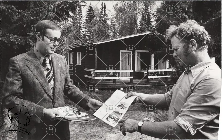 män, samtal, broschyr, stuga, skog, natur, svartvit, 1970-tal, kläder, fotografi, utomhus, möte, presentation, landskap, träd, byggnad, rekreation, turism, information, dokument, handskakning, vänskap, affär, diskussion, gruppbild, fritid, tradition, kultur, historia, resor