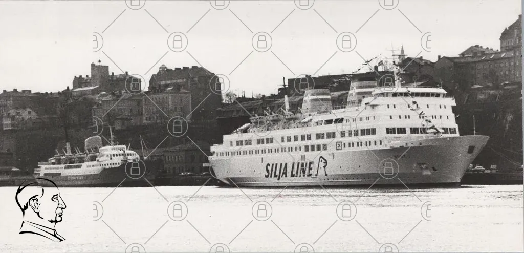 Silja Line, färja, båt, hamn, Stockholm, svartvit, sjöfart, passagerare, kryssning, vatten, byggnader, landskap, transport, resor, turism, sjö, kaj, hav, rederi, historia, arkitektur, skyline, nordisk, skandinavisk, kultur, semester, fritid, nöje, sjöresor, passagerarfärja