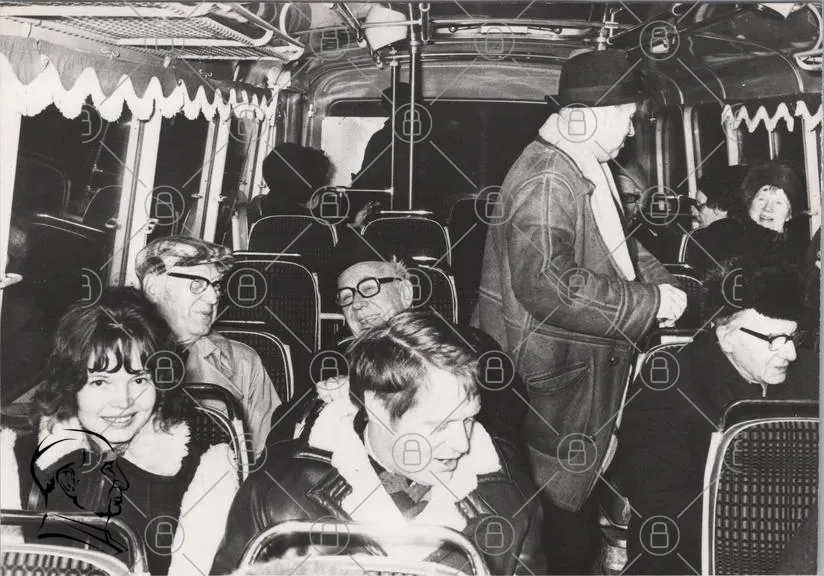 buss, passagerare, svartvit, 1960-tal, inomhus, kläder, leenden, män, kvinnor, resande, kollektivtrafik, nostalgisk, interiör, sittplatser, hattar, glasögon, ansikten, socialt, samvaro, stadsmiljö, retro, fotografi, människor, transport, vardag, gemenskap, minnen, historia, kultur