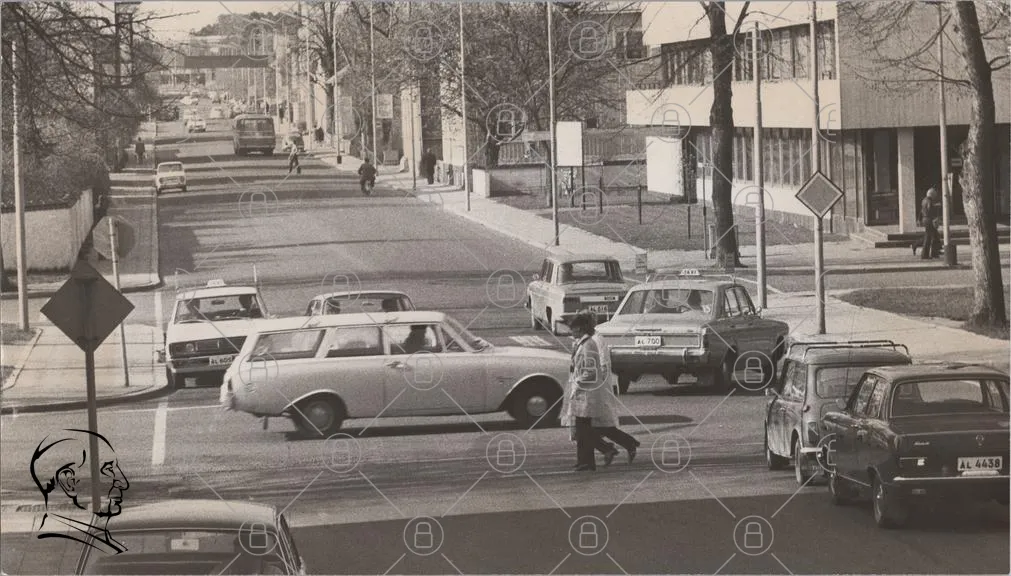 gata, bilar, trafik, människor, 1960-tal, svartvit, stad, korsning, träd, byggnader, taxi, gångväg, vägskyltar, fordon, fotgängare, parkering, trottoar, stadsbild, retro, historisk
