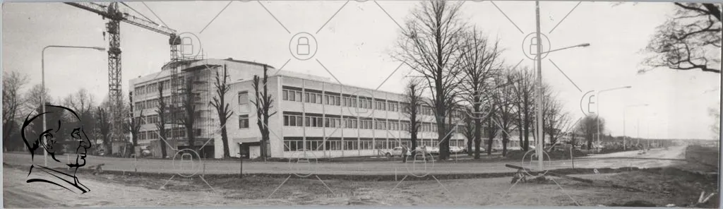byggnad, träd, väg, fönster, grå, svartvitt, arkitektur, skola, kontor, landskap, människor, cyklar, asfalt, utomhus, vinter, gammal, struktur, rader, betong, historia