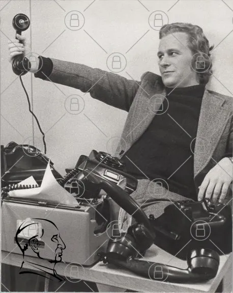 man, telefon, skrivmaskin, svartvitt, retro, kontor, 1970-tal, kommunikation, journalist, arbete, teknik, vintage, kreativitet, telefoner, kläder, ansiktsuttryck, inomhus, fokus, interaktion, skrivande, dokument, arbetsmiljö, nostalgi, stil, professionell, manlig, uttryck, hand, telefonledning, typografi