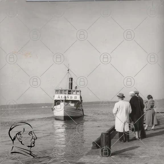 båt, Åland II, hamn, människor, 1940-tal, svartvitt, kaj, vatten, kläder, hattar, promenad, resande, landskap, transport, historia, turism, sjöfart, brygga, vågor, stillhet, nostalgi, kultur, semester, hav, ångbåt, passagerare, tidsepok, fotografering, tradition