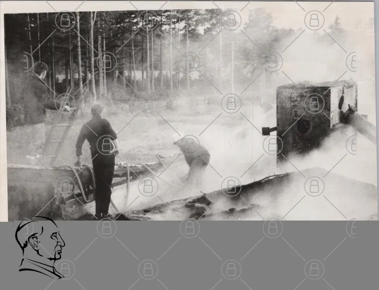 skogsarbete, män, rök, träd, skog, arbete, historisk, svartvit, maskin, ved, verktyg, natur, landskap, brand, skogsbrand, röjning, skogsavverkning, teamwork, utomhus, traditionell, gammal, industri, jordbruk, skogsbruk, säkerhet, kläder, hjälm, trä, miljö, rökskydd